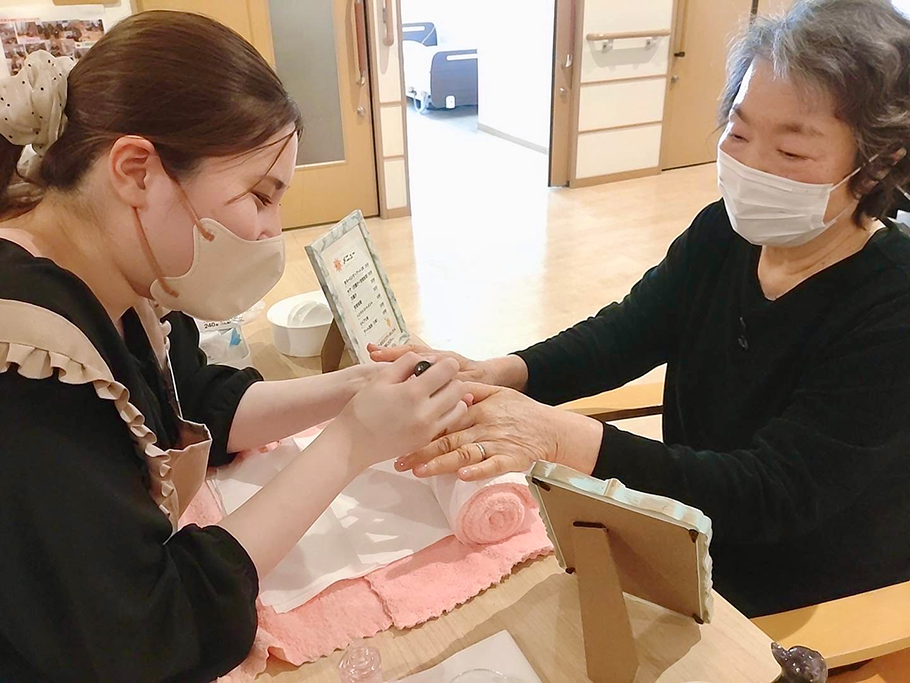 〜自然とあふれる笑顔〜 福祉ネイリストの方々が来館され爪のお手入れをして下さいました。 100歳を超えた利用者様は、人生初のネイルと恥ずかしそうにしていましたが とても嬉しそうでした。幾つになってキレイでいたいと思う気持ちは変わりませんね。